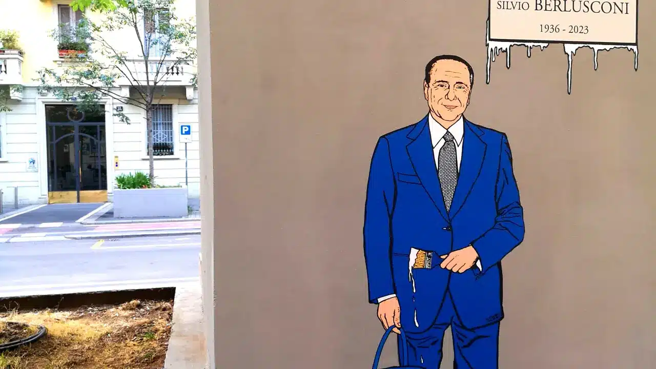 Questa è l’opera celebrativa dello street artist AleXsandro Palumbo, che ha deciso di donare al premier un regalo d’addio immortalandone la figura sulla facciata di una delle vie che meglio ne incarnano il rapporto con il capoluogo meneghino.